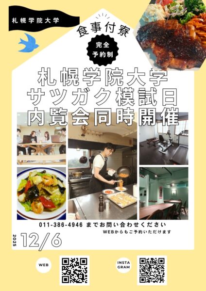 12月7日に開催される 「サツガク模試」 当日にあわせて、札幌学院大学の指定寮の内覧会を行っております。受験を控えた皆さまに、暮らしの場を実際にご覧いただけるよい機会として、ぜひお立ち寄りください。