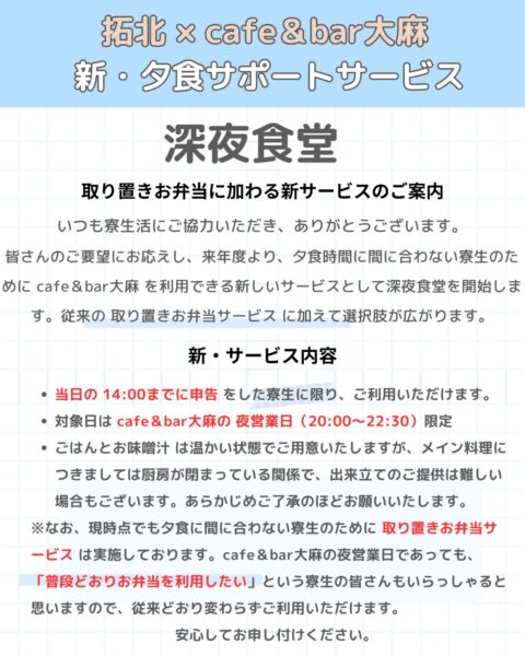 皆さんのご要望にお応えし、来年度より、夕食時間に間に合わない寮生のために cafe&bar大麻 を利用できる新しいサービスとして深夜食堂を開始します。従来の 取り置きお弁当サービス に加えて選択肢が広がります。